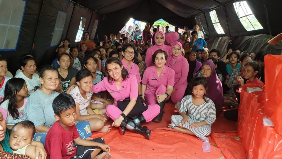 Ketua Bhayangkari Jakbar Tinjau Posko Berikan Bantuan Korban Banjir