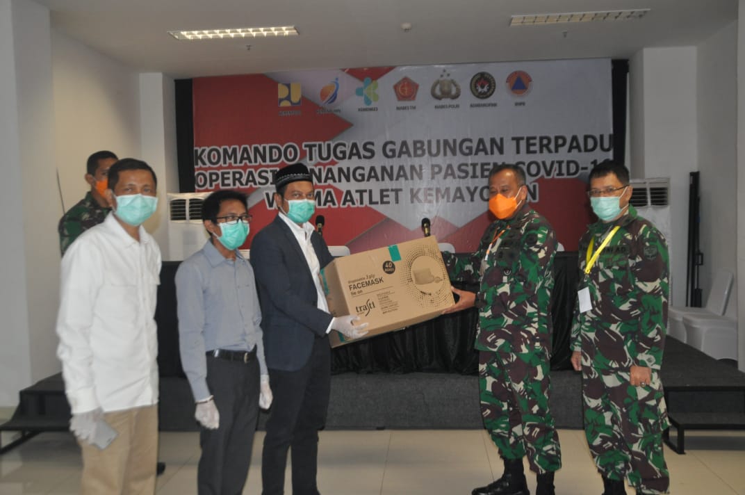 Penyerahan 10.000 pcs masker bedah tiga ply dilaksanakan secara simbolis dari Bapak Andika Roemin selaku Direktur PT Trasti Global Konverta kepada Kasdam Jaya selaku Wakil Kogasgabpad di RSD Wisma Atlet.