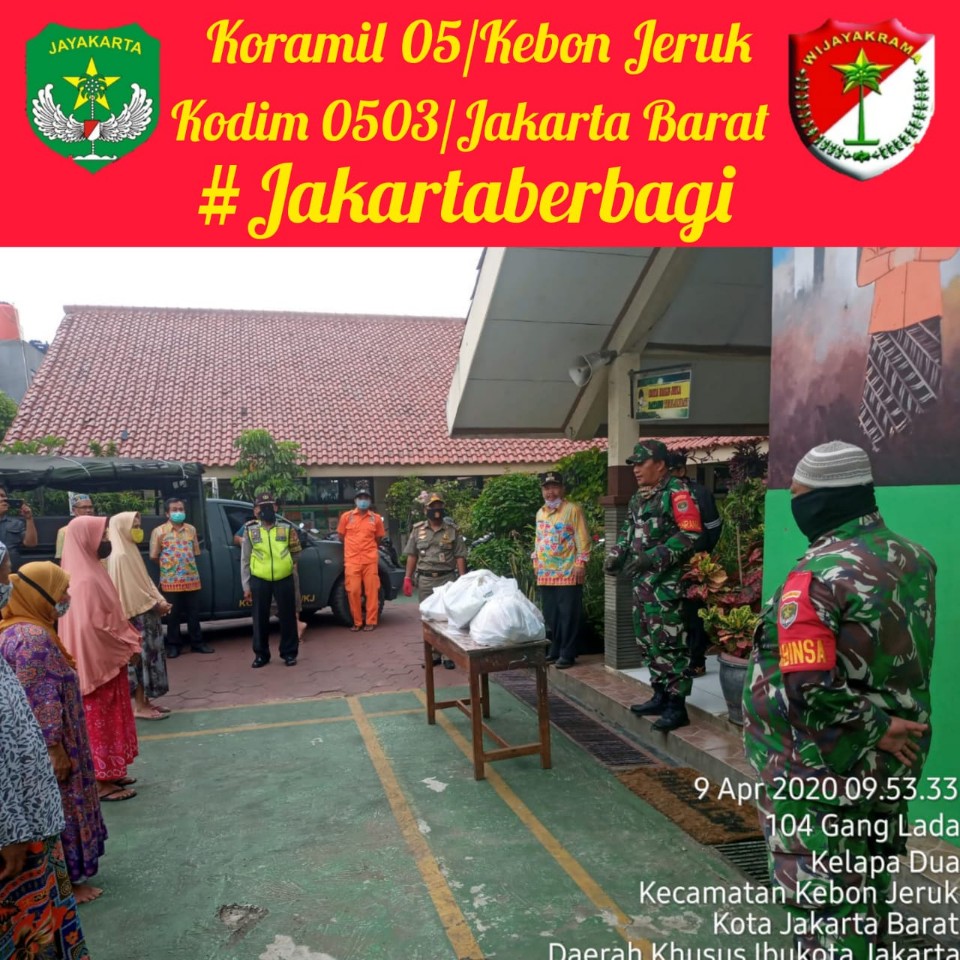 Danramil 05/Kebon Jeruk Kodim 0503/Jakarta Barat, Kapten Cpl R Edy Moerdoko beserta personil dan anggota tiga pilar melanjutkan kegiatannya dalam rangka Jakbarberbagi dengan membagikan paket sembako kepada warga yang terdampak Virus Covid-19, Kamis, (09/04/2020).