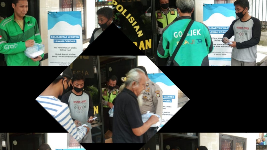 Polsek Metro Senen Polres Metro Jakarta Pusat bekerjasama dengan Masyarakat Palembang Wong Kito Galo Peduli, Pengusaha Warteg ATC (Aksi Tanggap Cepat, Rumah Makan Puri Minang Kramat Jati membagikan nasi box, di sejumlah lokasi wilayah Hukum Polsek Senen, Senin (20/4), siang.