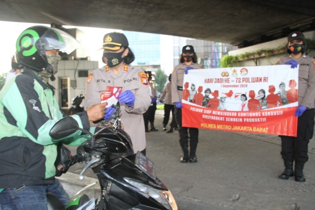Salah satunya dilakukan jajaran Polisi Wanita (Polwan) Polres Metro Jakarta Barat yang menggelar kegiatan bagi-bagi masker di perempatan lampu merah Slipi Jakarta Barat dalam rangka menyambut Hut polwan ( polisi wanita) ke 72, Senin (31/08/2020).