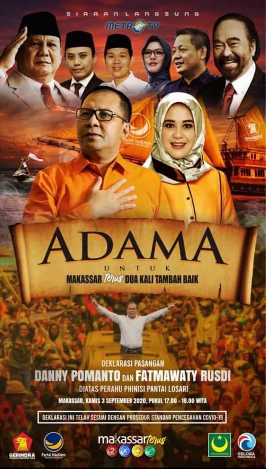 Terkait dengan terganggunya citra Partai Nasdem, maka kubu ADAMA sore ini, Kamis (03/09) telah melakukan deklarasi secara kolosal untuk memulihkan kepercayaan publik Mereka nenggunakan Perahu Pinisi acara deklarasi kolosal itu di adakan di atas laut di Pantai Losari dengan dihadiri ratusan relawan. Pasangan ADAMA diusung oleh Nasdem dan Gerindra serta didukung Partai Gelora dan PBB.
