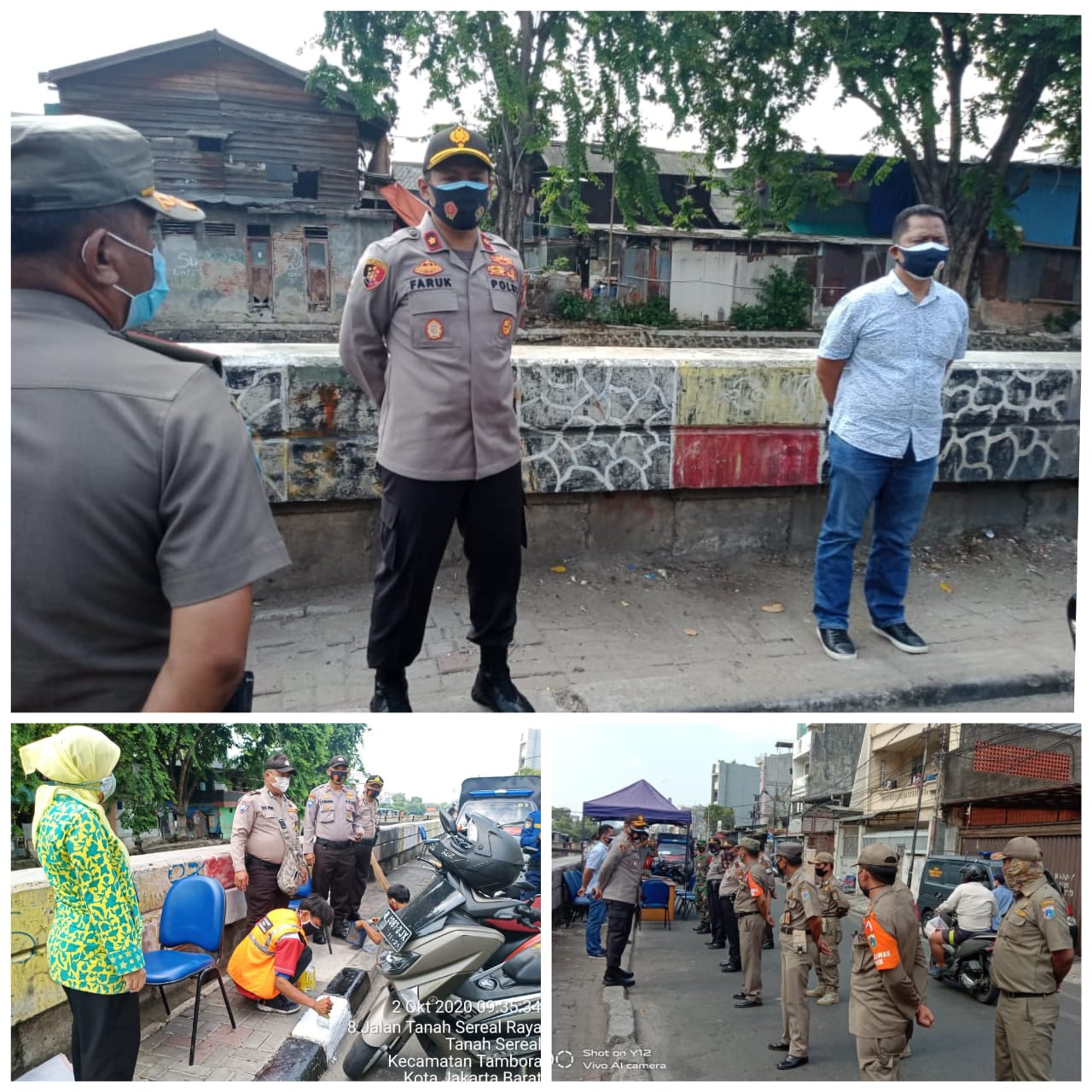 JAKARTA,- JOURNALREPORTASE- Di Jalan Tanah Sereal Tambora Jakarta Barat menjadi titik bagi 49 personil gabungan dari unsur tiga pilar Kecamatan Tambora untuk melakukan operasi yustisi, Jumat (02/10/2020) pagi.