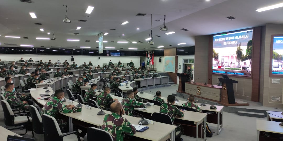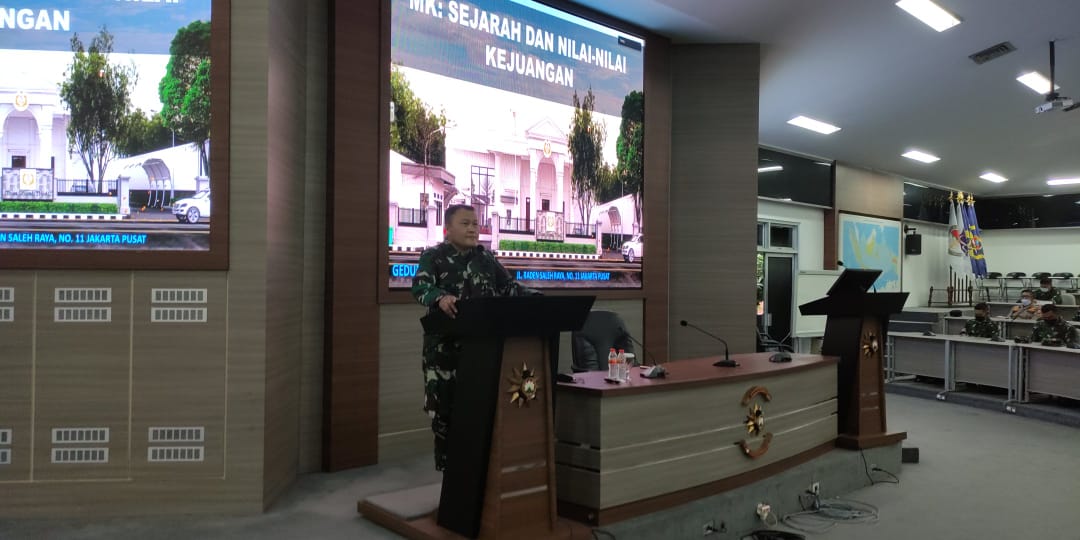 Kepala Dinas Sejarah TNI Angkatan Laut (Kadisjarahal) Laksamana Pertama TNI Supardi, S.E., M.B.A., CHRMP., memberikan kuliah tentang Sejarah dan Nilai-nilai Kejuangan kepada Perwira Siswa (Pasis) Pendidikan Reguler (Dikreg) Sekolah Staf dan Komando TNI Angkatan Laut (Seskoal) Angkatan ke-59 TA 2021 di Kelas A Gedung R.E. Martadinata Seskoal, Cipulir, Jakarta Selatan, Selasa (18/05).
