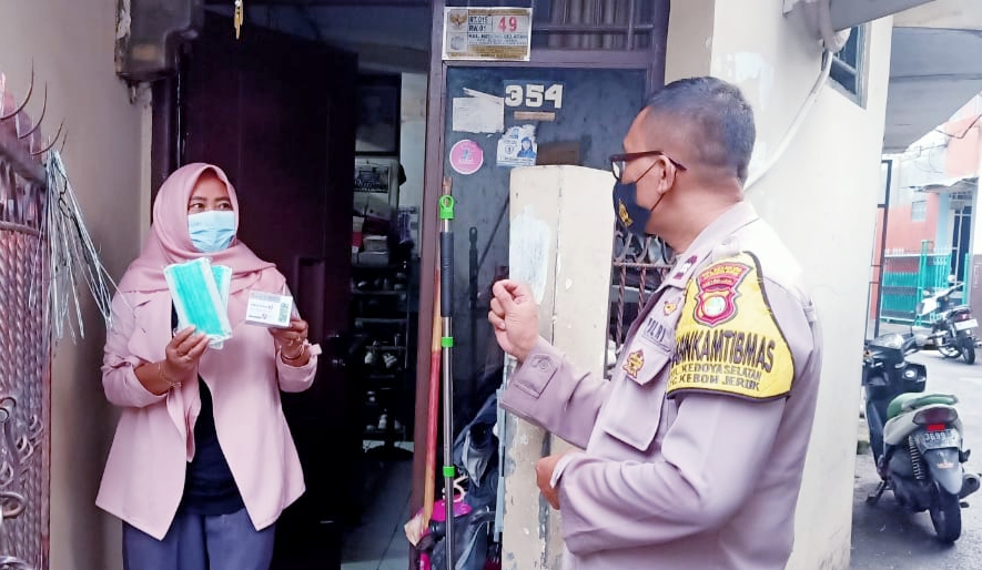 JAKARTA-JOURNALREPORTASE- Bhabinkamtibmas Polsek Kebon Jeruk Polres Metro Jakarta Barat melakukan pengecekan by name by address warganya yang Terpapar Covid-19.