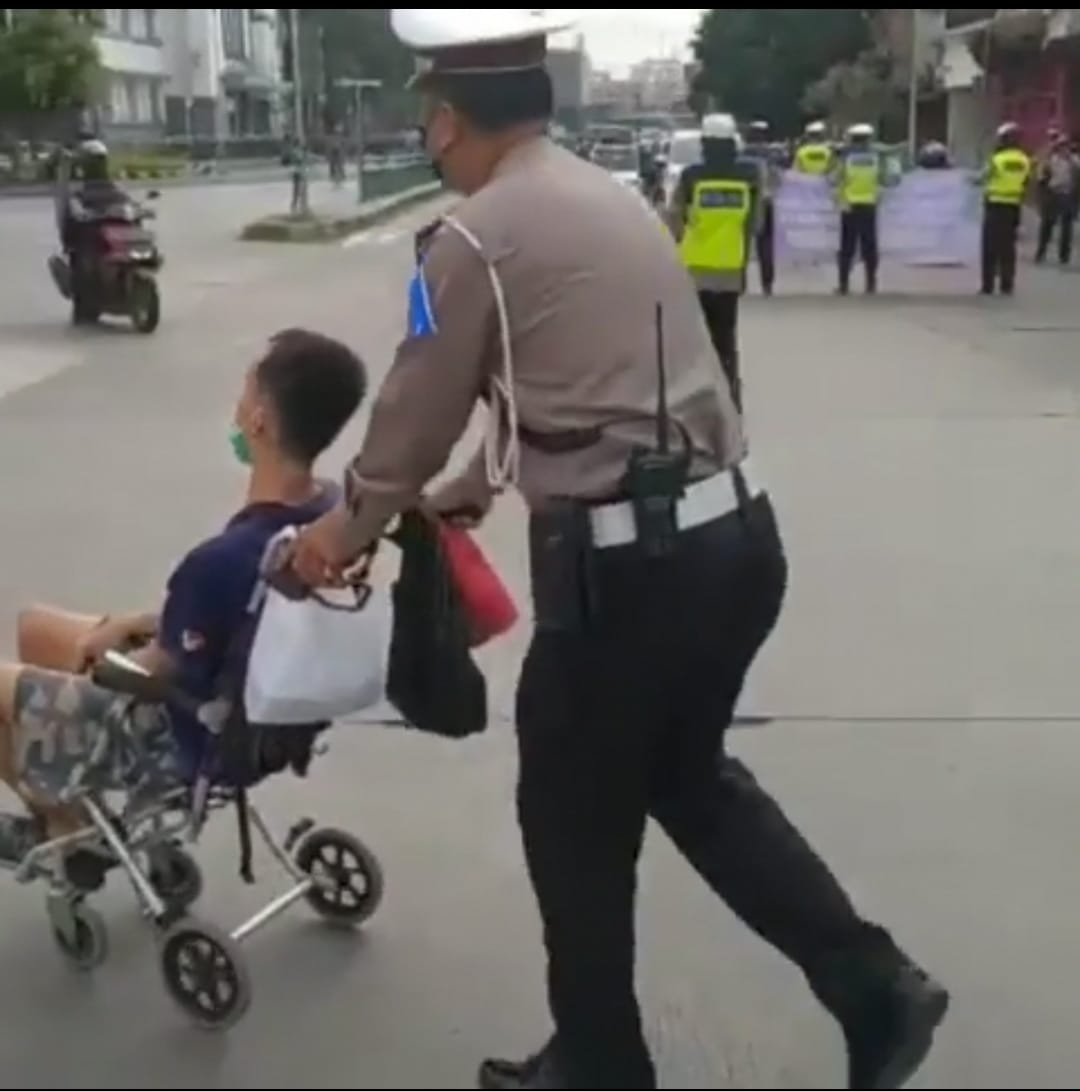 Menyadari seseorang tersebut adalah seorang disabilitas kemudian kanit lantas taman sari kompol Turyono dengan sigap memberikan pertolongan