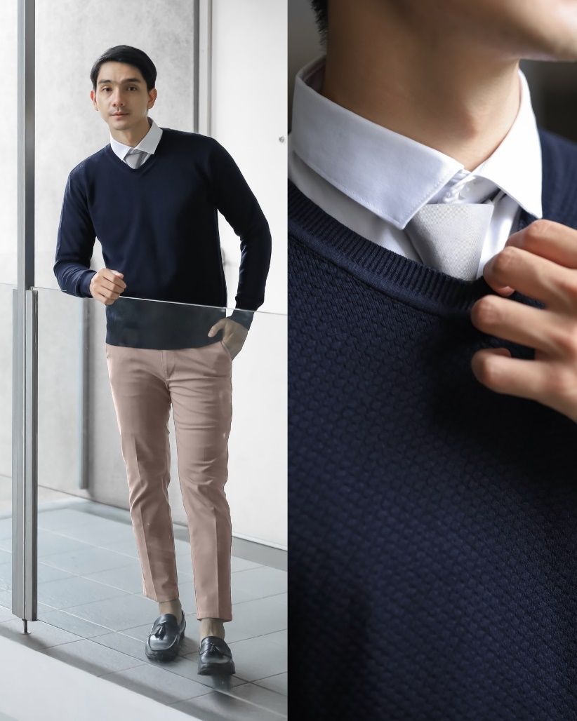 Yang paling utama kalau mau menampilkan smart casual adalah gunakan kemeja kerjamu dengan sweater knit. Biarkan kerah kemeja menyembul keluar sweater sebagai aksen. Pilih kemeja dan sweater dengan warna senada.