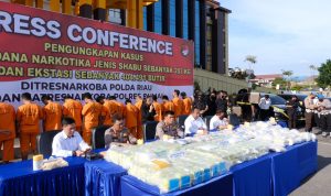 PEKANBARU – JOURNALREPORTASE- Polda Riau kembali membongkar peredaran gelap narkotika. Kali ini Kerjasama Direktorat Reserse Narkoba (Ditnarkoba) bersama Direktorat Intelkam dan Polres Dumai berhasil meringkus 16 tersangka komplotan narkoba.