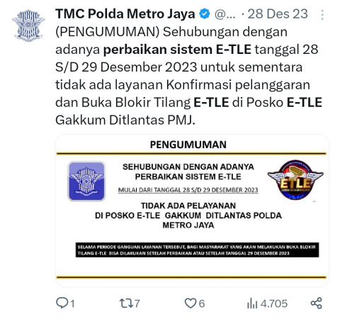 “(PENGUMUMAN) Sehubungan dengan adanya perbaikan sistem E-TLE tanggal 28 S/D 29 Desember 2023 untuk sementara tidak ada layanan Konfirmasi pelanggaran dan Buka Blokir Tilang E-TLE di Posko E-TLE Gakkum Ditlantas PMJ,” cuit akun X @TMCPoldaMetro pada 27 Desember 2023 lalu.