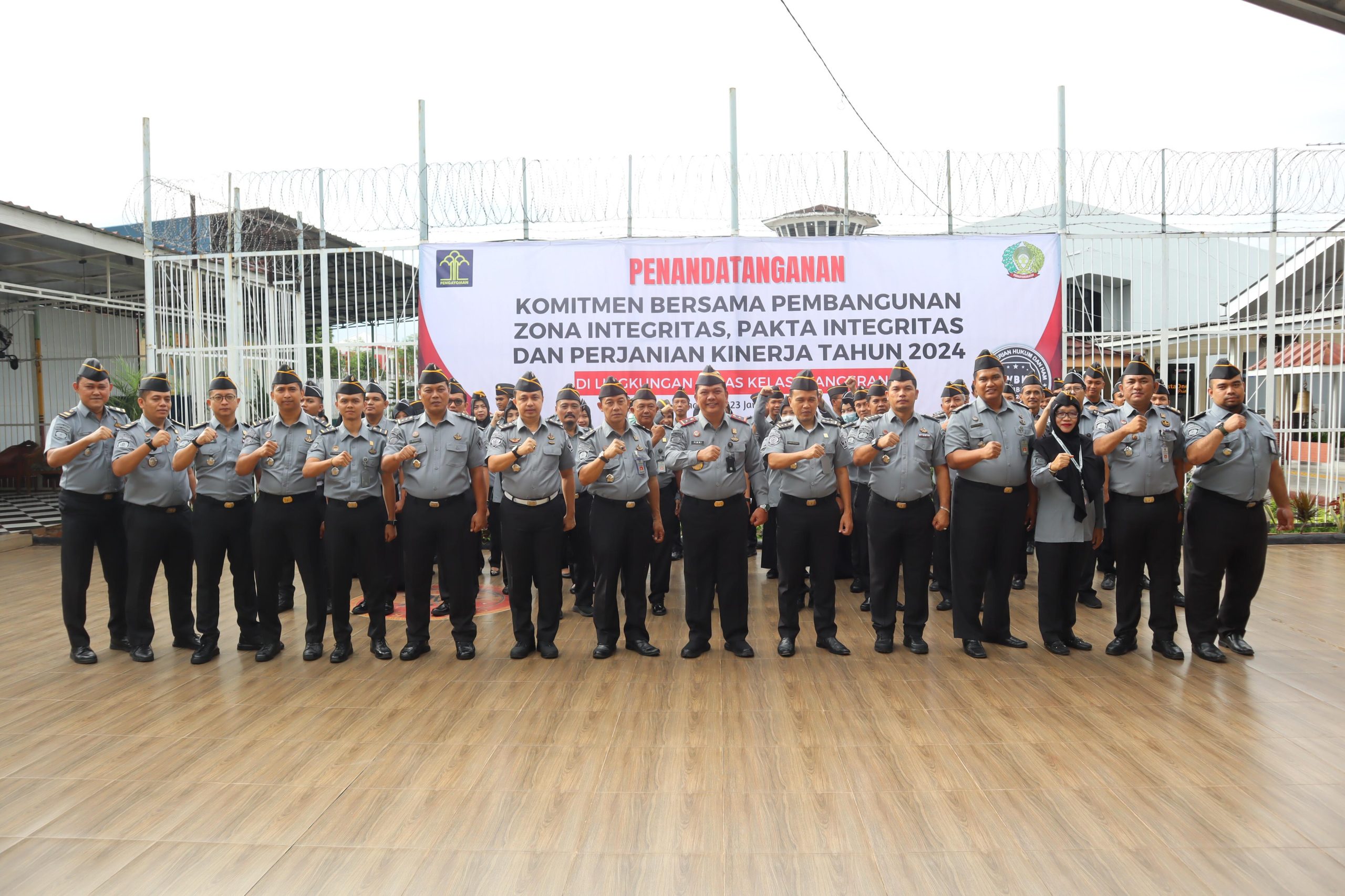 TANGERANG- Lapas Kelas I Tangerang Kemenkumham Banten melaksanakan kegiatan Penandatanganan Komitmen Bersama Pembangunan Zona Integritas, Pakta Integritas, Penandatanganan Perjanjian Kinerja tahun 2024 di Lapangan Upacara Lapas Kelas I Tangerang, Selasa (23/01/2024).