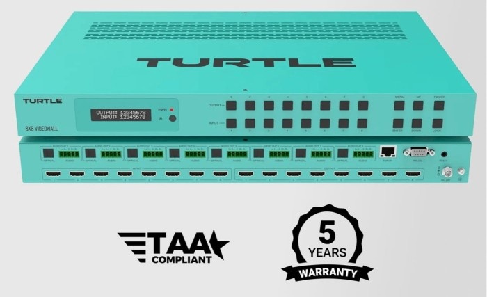 Video Processor Turtle AV menawarkan kontrol multi-platform melalui WebGUI, panel depan, RS-232, dan integrasi API lengkap. Perangkat ini dilengkapi manajemen EDID lanjutan, keamanan HDCP 2.2, serta desain rangka logam berkualitas tinggi dengan warna khas Turtle Aqua.