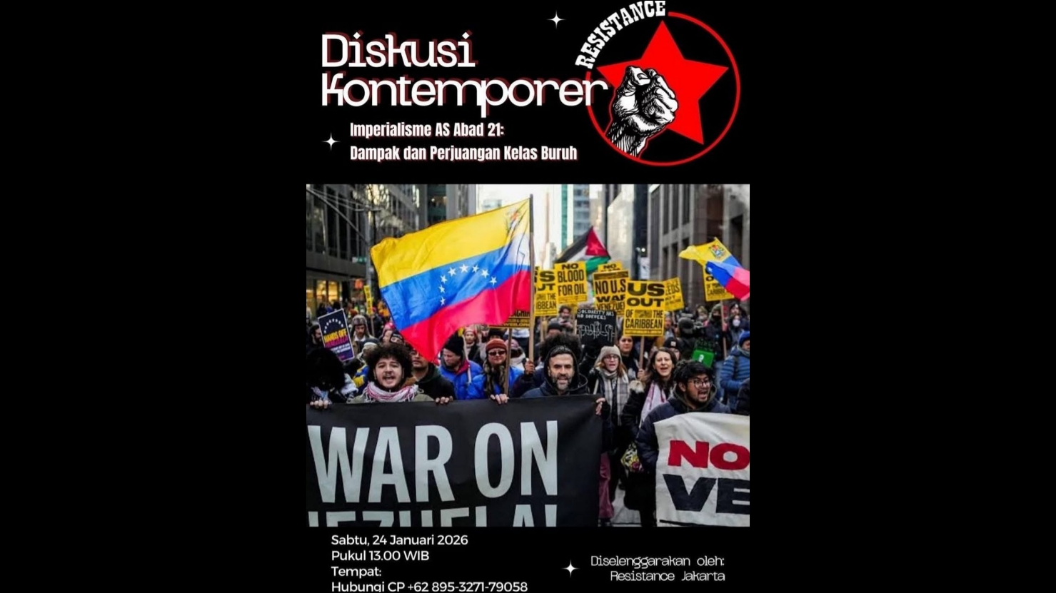 “Lantas bagaimana kaum sosialis harus mengambil posisi di tengah situasi seperti ini? Apa yang bisa kita lakukan? Mari bahas lebih lanjut di diskusi ‘Imperialisme AS Abad-21: Dampak dan Perjuangan Kelas Buruh’, Sabtu, 24 Januari 2026 pukul 13.00 WIB, tempat hubungi CP R: +62 895-3271-79058. Diselenggarakan oleh Resistance Jakarta,” bebernya.