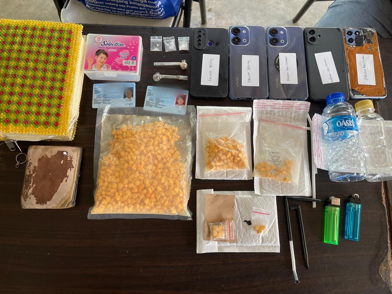 Dari hasil penggeledahan di lokasi, petugas menemukan barang bukti berupa 1.013 butir pil ekstasi dengan berat total 343 gram, tiga paket sabu seberat 1,27 gram, alat hisap, beberapa unit telepon genggam, serta buku catatan yang diduga berkaitan dengan transaksi narkotika.