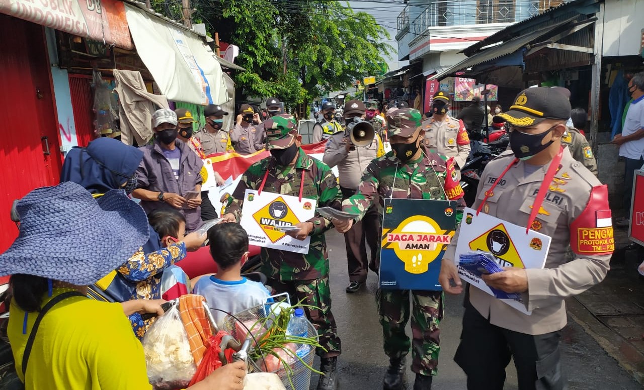 JAKARTA- Danramil 02/Matraman Mayor Inf Dasiya bersama Kapolsek Matraman Kompol Tedjo Asmoro membagikan masker gratis.