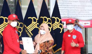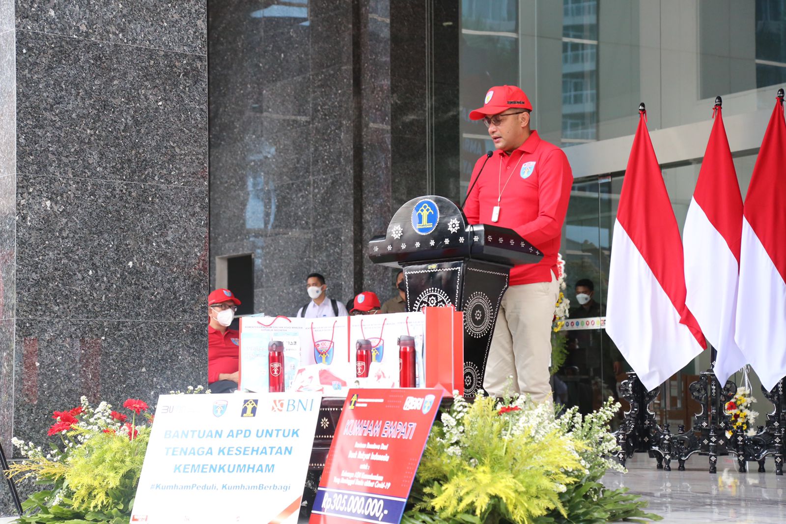 Wakil Menteri Hukum dan HAM didampingi Sekjen serta Staf Ahli Bidang Ekonomi, Lucky Agung Binarto menyerahkan bantuan berupa APD kepada Ketua Perhimpunan Tenaga Kesehatan (Pernakes). Tak hanya itu, bantuan berupa beasiswa juga diberikan kepada