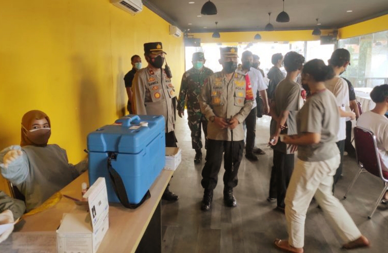 JAKARTA- JOURNALREPORTASE- Kapolres Jakarta Utara Kombes Pol Guruh Arif Darmawan memantau kegiatan vaksinasi Merdeka Mobile dan Ramly Center di Saung KWK Jakarta, Jalan Pedongkelan RT 006 RW 006 kelurahan Semper Timur, Senin (9/8).
