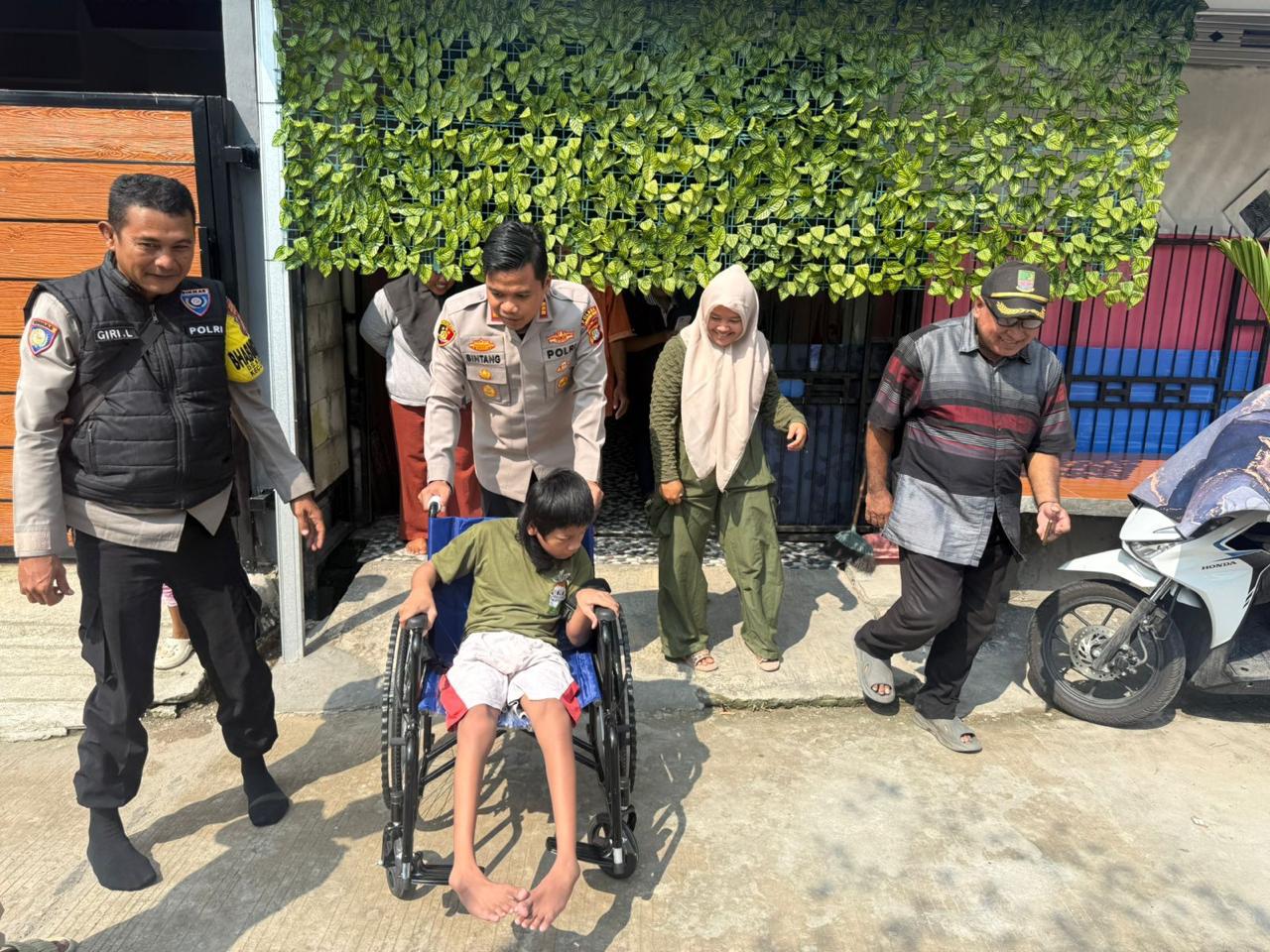 Kapolsek Cikarang Barat, AKP Tri Baskoro Bintang W, menyerahkan bantuan secara langsung kepada Reno Purnama (12), seorang anak penyandang disabilitas.