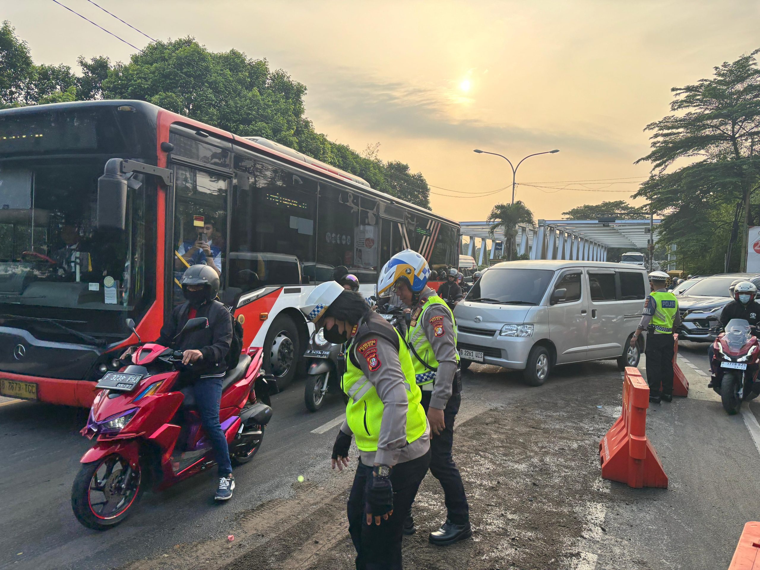 Personel Sat Lantas Polrestro Depok Bersihkan Tumpahan Oli yang Bahayakan Pengguna Jalan