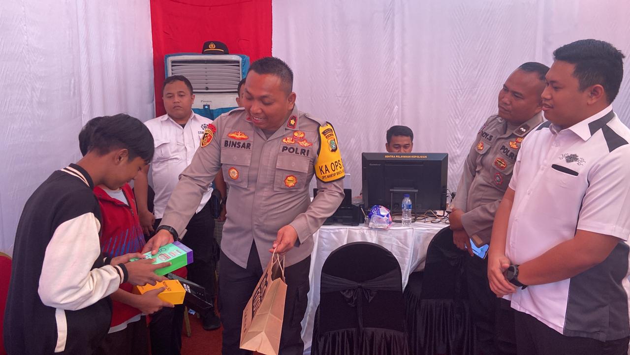 JAKARTA – JOURNALREPORTASE- Dua bocah korban penipuan akhirnya bisa tersenyum bahagia, lantaran Handphone (Hp) miliknya yang dibawa kabur oleh pelaku tergantikan dan diberikan langsung oleh Kapolsek Pademangan Kompol Binsar Hatorangan Sianturi.