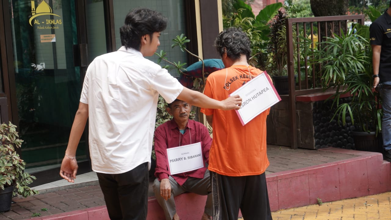 Sementara rekonstruksi dilaksanakan di halaman Polsek Kebon Jeruk ini menghadirkan tersangka EH (56), diduga telah melakukan penganiayaan terhadap korban MBS (65) merupakan bos agen gas elpiji 3 kg. Korban meninggal dunia akibat luka tusuk di bagian pinggang.