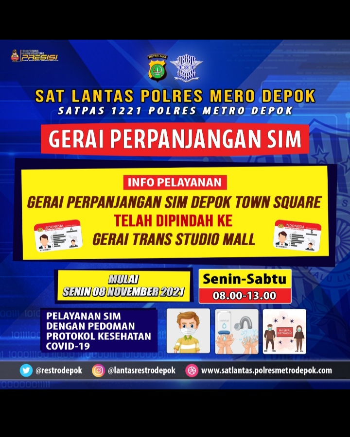 “Info pelayanan Gerai perpanjangan SIM Depok Town Square telah dipindah ke Gerai Trans Studio Mall mulai Senin 08 November 2021,” tulis keterangan resmi Satuan Lalu Lintas Polres Metro Depok, dikutip journalreportase.com, Kamis (4/11/2021).