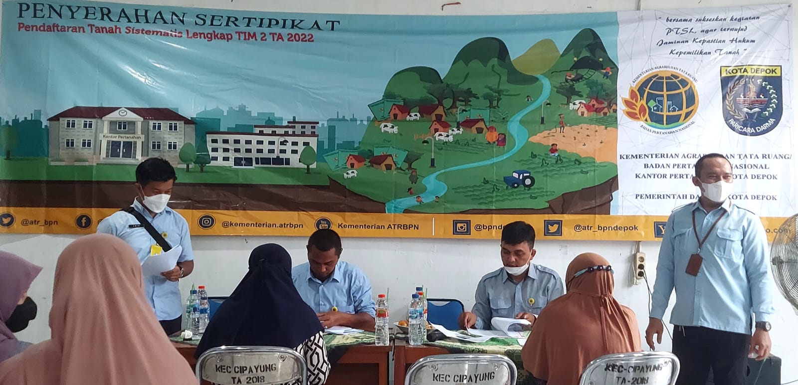 Hadir dalam kegiatan ini mendampingi Kapala BPN Kota Depok diantaranya Oma Kasubsi Balik Nama yang juga ketua team, Wakil Walikota Depok yang di wakili oleh Camat Cipayung Hasan Nurdin.