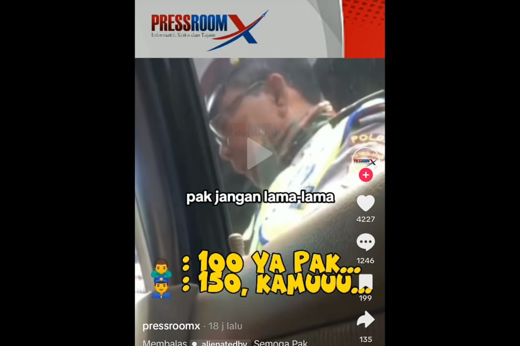 Dilihat dalam video yang diunggah akun TikTok @pressroomx ini tampak oknum polantas berkacamata itu menekan pelanggar agar segera menyerahkan sejumlah uang. Meski begitu, pengunggah video tak membeberkan lokasi dan waktu dari kejadiannya.